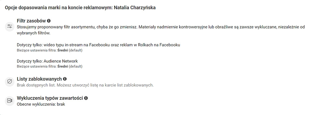 Natomiast w zakładce “Środki kontroli” możesz ustawić “moc” automatycznego filtra, który samodzielnie ocenia, gdzie twoje reklamy mogą się wyświetlać a gdzie nie powinny. Domyślnie ustawiony jest filtr Średni.
