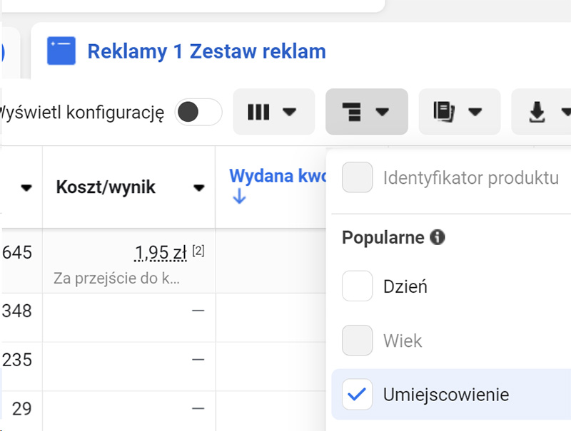 Aby sprawdzić, gdzie wyświetlają się twoje reklamy, skorzystaj z opcji Podział, widocznej w prawym górnym rogu tabeli wyników w Menedżerze reklam.